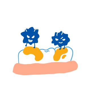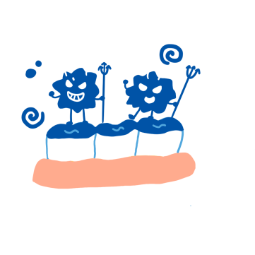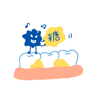 むし歯菌が食べかす(糖分)をエサに増殖してネバネバした物質を作り出します。このネバネバがプラークです。